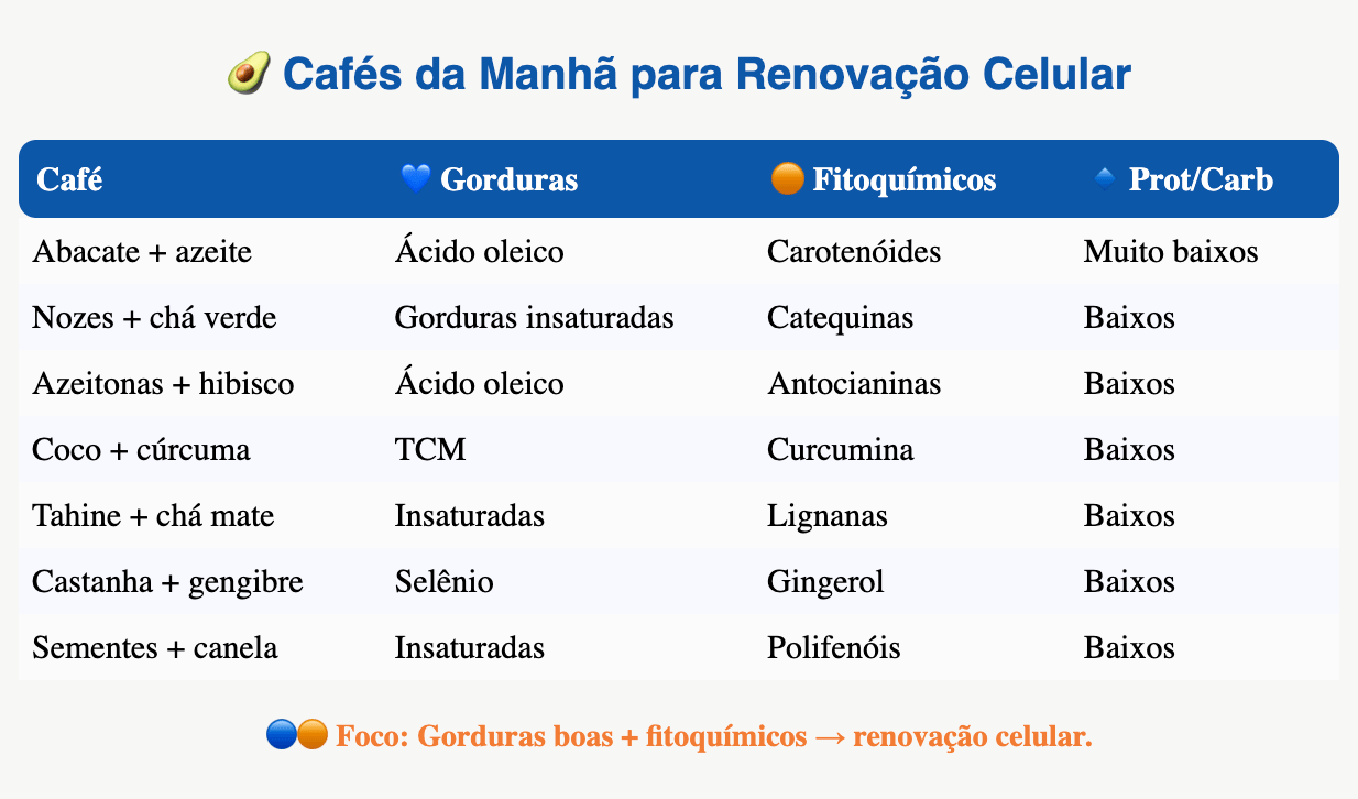 Após as 8h, café da manhã com poucas proteínas e poucos carboidratos, mas rico em gorduras boas e fitoquímicos (ex.: abacate com azeite e sal).