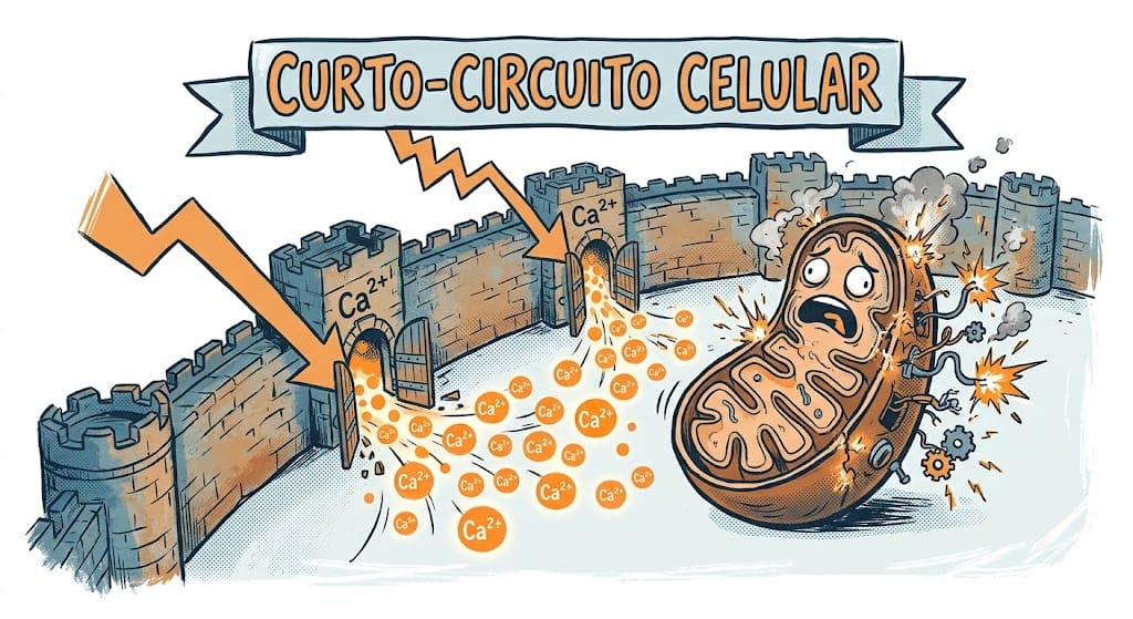 O excesso de cálcio inunda as mitocôndrias. O Complexo III da cadeia respiratória entra em colapso e começa a vazar elétrons. Esses elétrons viram radicais livres.