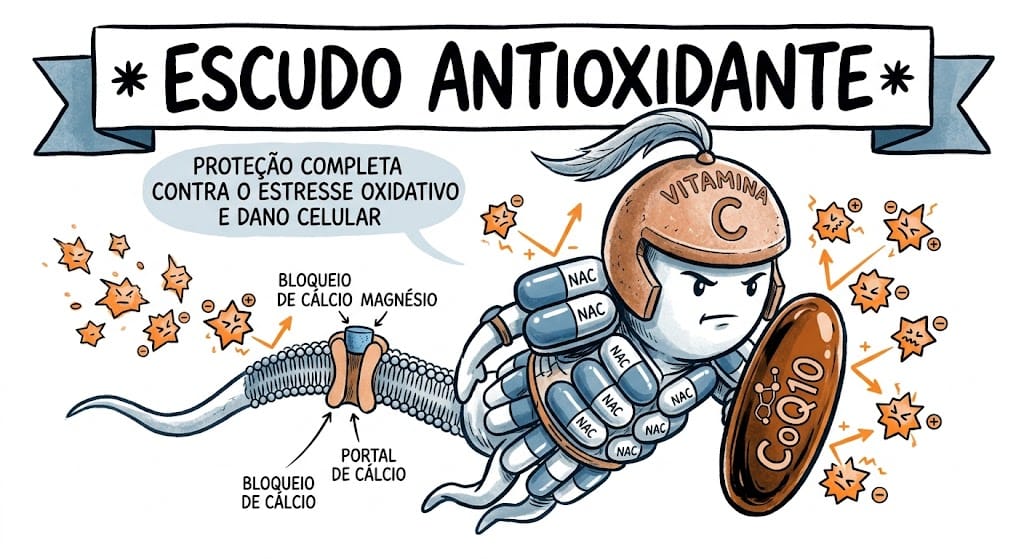 ✨ Nota: Nenhum ensaio humano testou essa suplementação contra radiação de celular no esperma. A evidência vem de estudos in vitro e de ensaios com antioxidantes para infertilidade masculina.