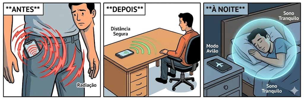 🔷 Tire o celular do bolso, ative o modo avião quando possível, durma sem o aparelho no quarto.