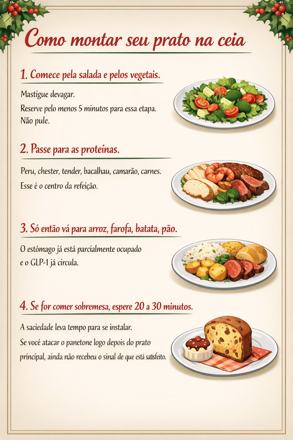 2️⃣ Coma salada e proteína primeiro. Amido e doce por último.