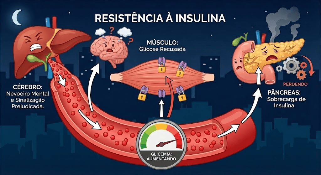 A resistência à insulina significa que suas células ignoram o sinal da insulina. O pâncreas compensa produzindo mais. O resultado: mais fome, mais gordura abdominal e mais cansaço.
